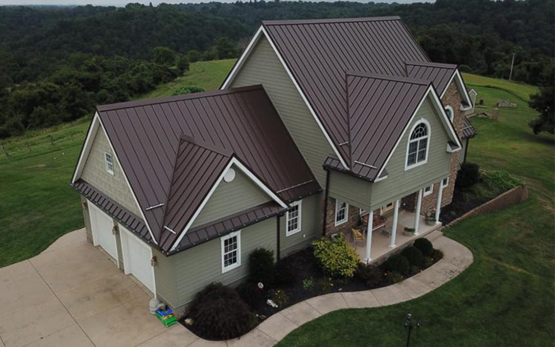This image presents a spacious home with a modern brown standing seam metal roof, enhancing both aesthetics and performance. The metal panels create clean lines that complement the home’s green siding and stonework, offering a sleek, weather-resistant alternative to traditional roofing. Ideal for rural and hilly regions, this metal roof combines durability, energy efficiency, and curb appeal in one elegant solution.